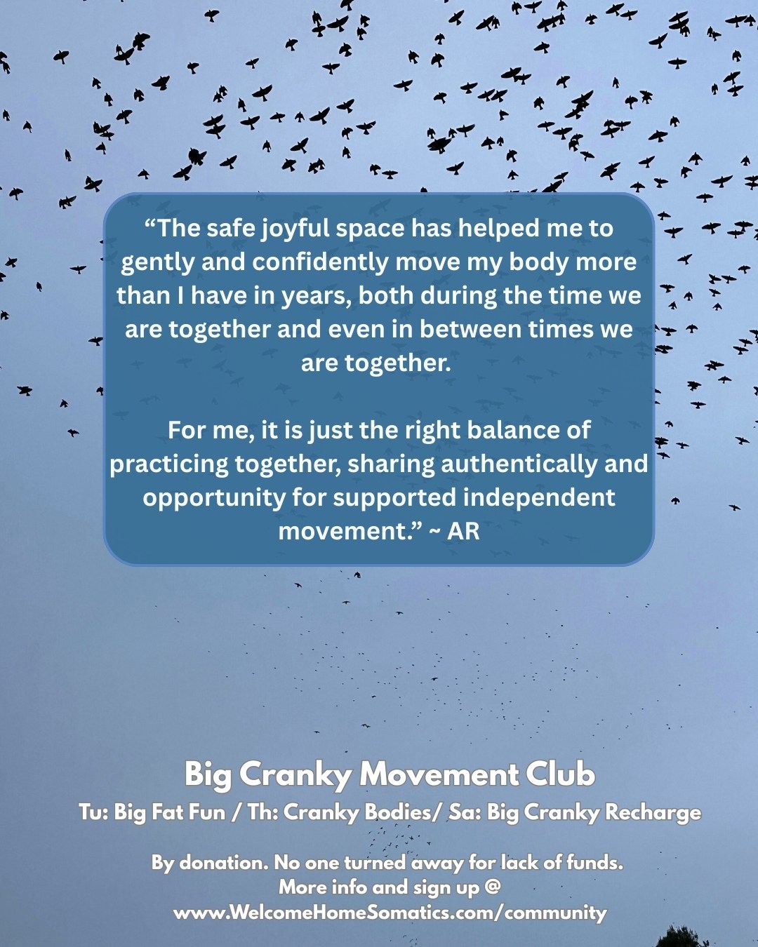 Like a co-working space, these are virtual inclusive co-moving spaces! Co-hosted by fellow somatic practitioners Regan B and Lisa S, we offer three different groups, each following the same structure.
